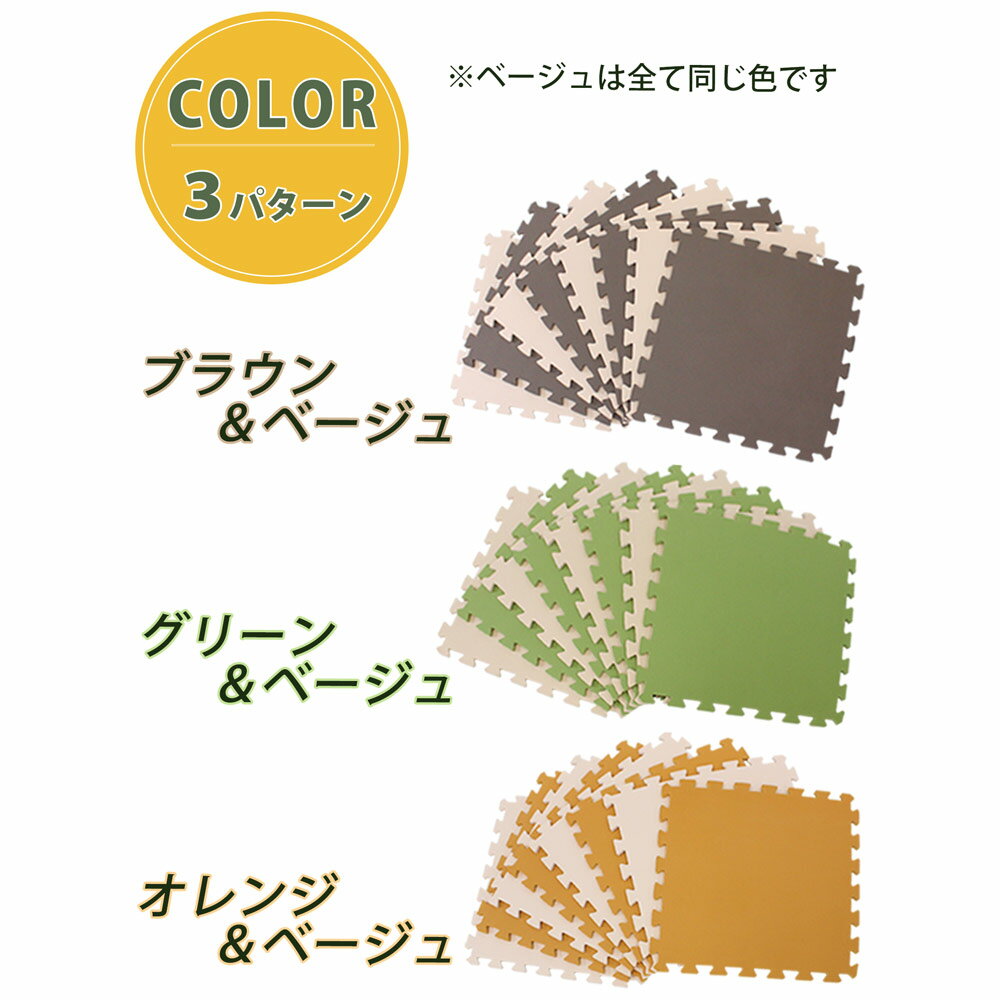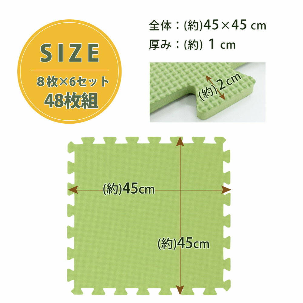 45cm角ジョイントマット48枚組(6畳分) 仕様 カラー ブラウン×ベージュ、グリーン×ベージュ、オレンジ×ベージュ 入枚数 48枚(8枚×6セット) サイズ (約)45×45cm 厚み:(約)1cm 材質 EVA 使用上のご注意 ●床材等の種類によっては、長時間同じ場所に置いておくと床材表面がマット裏面に移行する可能性があります。