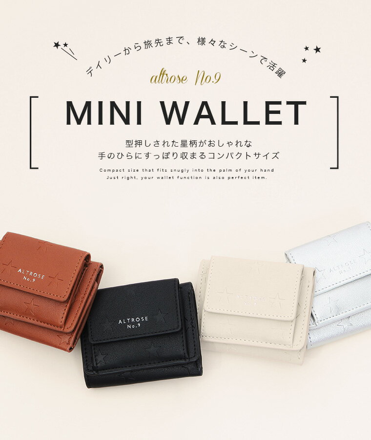 スター型押し 3つ折り ミニウォレット レディース メンズ サイズ タテ ヨコ 厚さ フリー 8.0cm 9.8cm 2cm 重量 約71g カラー ブラック / キャメル / アイボリー / シルバー 備考 外:ポケット小銭入れ×1 内:札入れ×1 / カード入れ×4 素材 PVC 生産国 中国 商品コメント 大人カラーがおしゃれなフェイクレザーに 型押しの星柄がポップで可愛い◎ コンパクトなサイズ感の大人可愛い3つ折りプチウォレット。