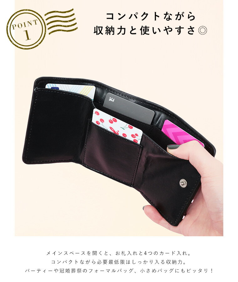 パーティーや冠婚葬祭のフォーマルバッグ、お出かけ用の小さめのバッグ、 旅行やフェスなど身軽なコーデ用にぴったりなサイズ感は 小さいながらもお札、カード、小銭もしっかり入る収納力。