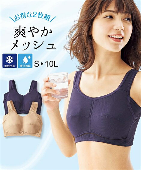 ブラジャー ノンワイヤー 大きいサイズ レディース 接触冷感 吸汗速乾 脇汗取り パッド付 ブラ内蔵 メッシュ ハーフ トップ 2枚組 夏 ネイビー+スキンベージュ 8L/10L ニッセン